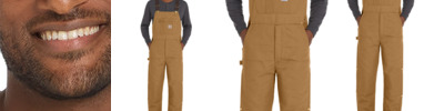 12-ounce, firm hand, 100% ring spun cotton duck canvas Quilted nylon lining to waist for easy on and off; 100% polyester insulation to waist for midweight warmth Adjustable elastic suspenders Multi-compartment bib pocket with zip closure Zipper fly Two large front pockets Hammer loop on right leg Seam-to-seam chap-style double-front construction Double-layer knees with openings for added knee pads and cleaning out debris Ankle-to-thigh leg zippers with storm flaps and snap closures Reinforced Cordura ® back-leg kick panels Two reinforced back pockets Metal rivets at vital stress points Carhartt-strong, triple-stitched main seams Carhartt label sewn on bib pocket 33-inch inseam Loose fit